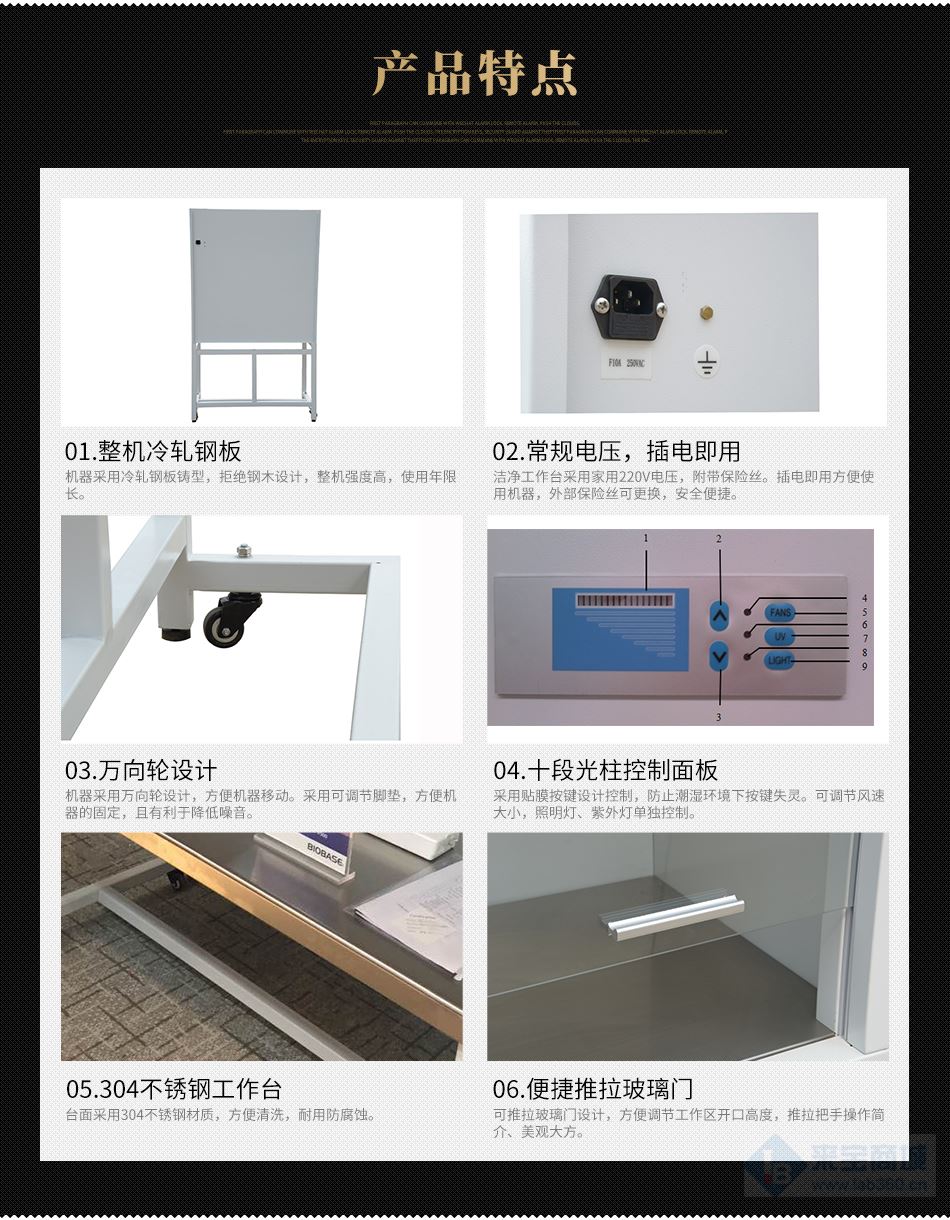 1.11 底腳頂絲、潔凈臺萬向輪的設計,潔凈臺可通過萬向輪移動且可以通過調節(jié)底腳頂絲固定調平。