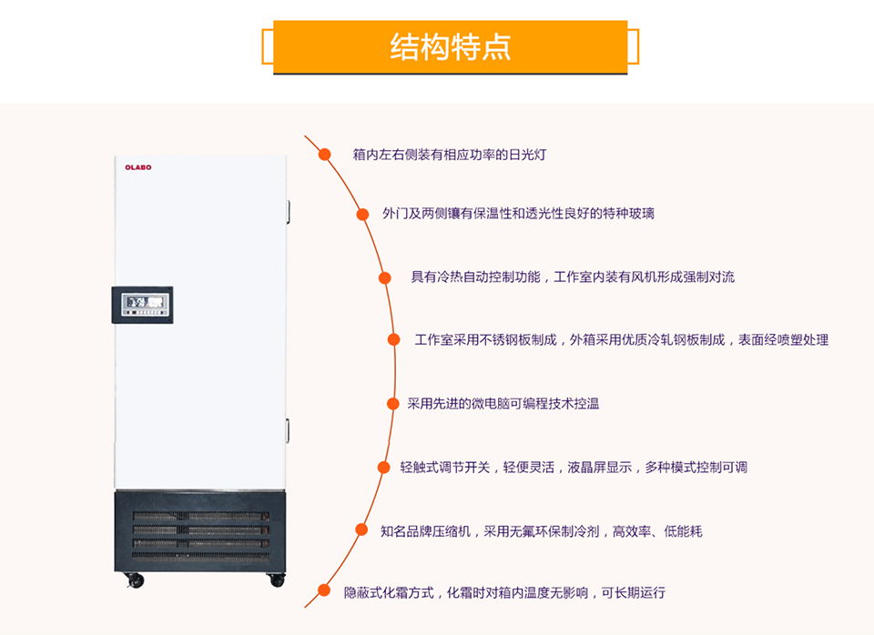 1、該產(chǎn)品箱內(nèi)左右側裝有相應功率的日光燈,在外門及兩側鑲有保溫性和透光性良好的特種玻璃,以減少日光燈入射光的熱量傳入,既滿足室內(nèi)樣品所需光照度,同時便于觀察。具有冷熱自動控制功能,工作室內(nèi)裝有風機形成強制對流,使工作室內(nèi)平均溫度更好,整機工藝先進,工作室采用不銹鋼板制成,外箱采用優(yōu)質冷軋鋼板制成,表面經(jīng)噴塑處理,箱體造型美觀大方