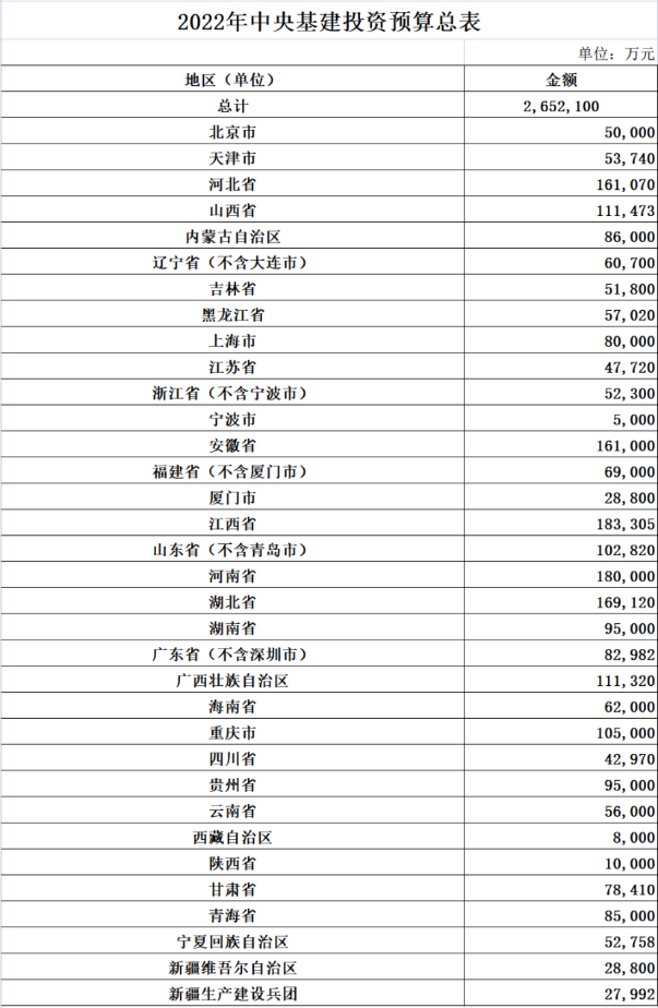 各省中央基建投資預(yù)算如下(各省詳細(xì)項(xiàng)目見后文):