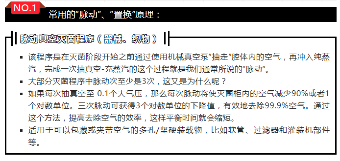 脈動真空滅菌程序(器械、織物):該程序是在滅菌階段開始之前通過使用機械真空泵“抽走”腔體內的空氣,再沖入純蒸汽,完成一次抽真空-充蒸汽的這個過程就是我們通常所說的“脈動”。