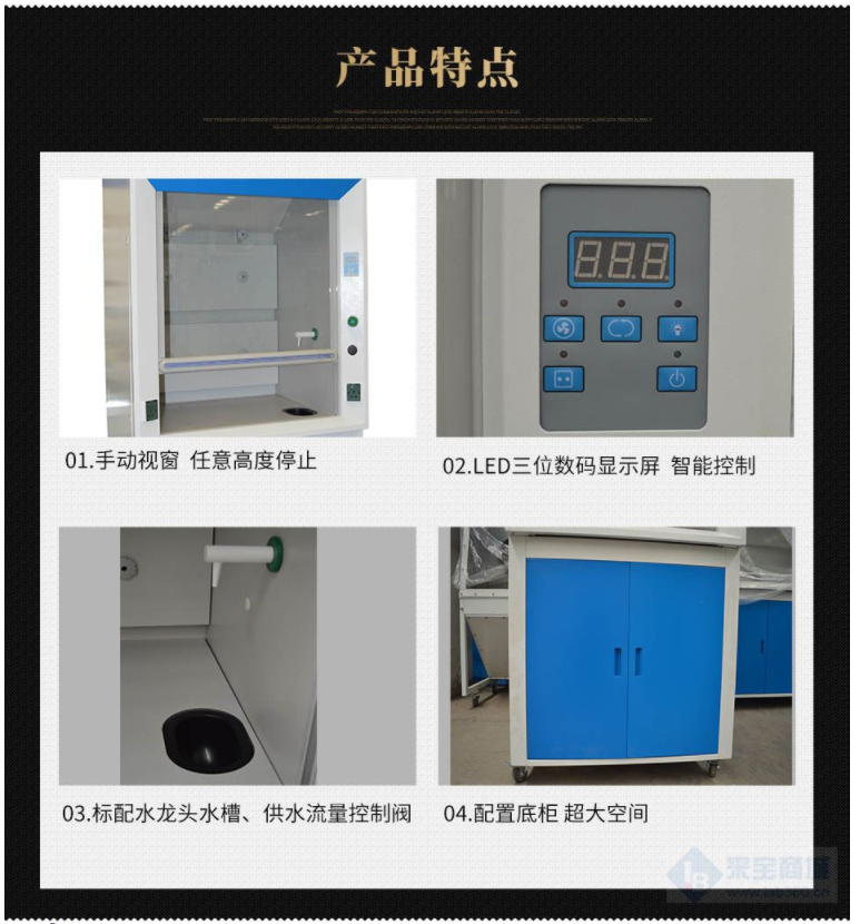 * 8、通風(fēng)柜配置底柜,底柜采用1.0mm冷軋鋼板經(jīng)防銹處理,靜電噴涂,具有較好的光潔度與耐腐蝕性;底柜1660*480*635mm(L×D×H)的超大空間可以放置實(shí)驗(yàn)室用品;底柜與上柜體配套使通風(fēng)柜更加美觀實(shí)用。