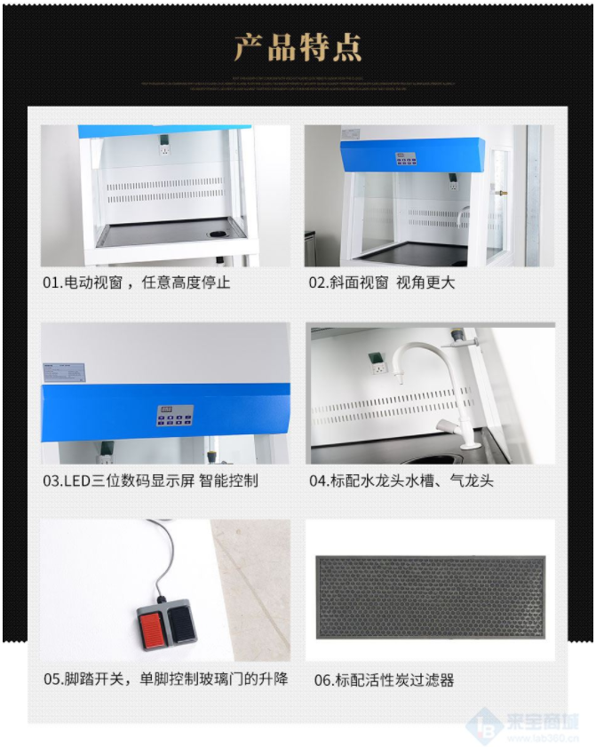 * 11、通風柜配置腳踏開關,單腳控制玻璃門的升降,更加實用。