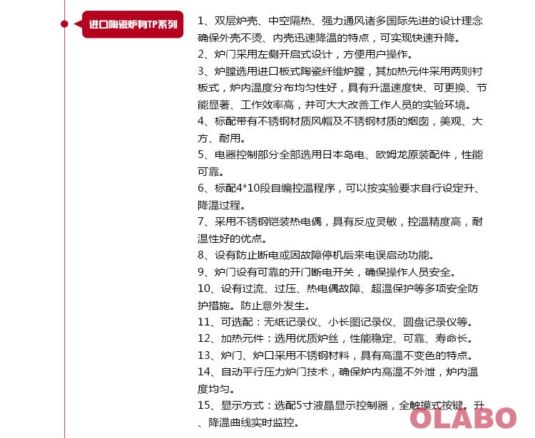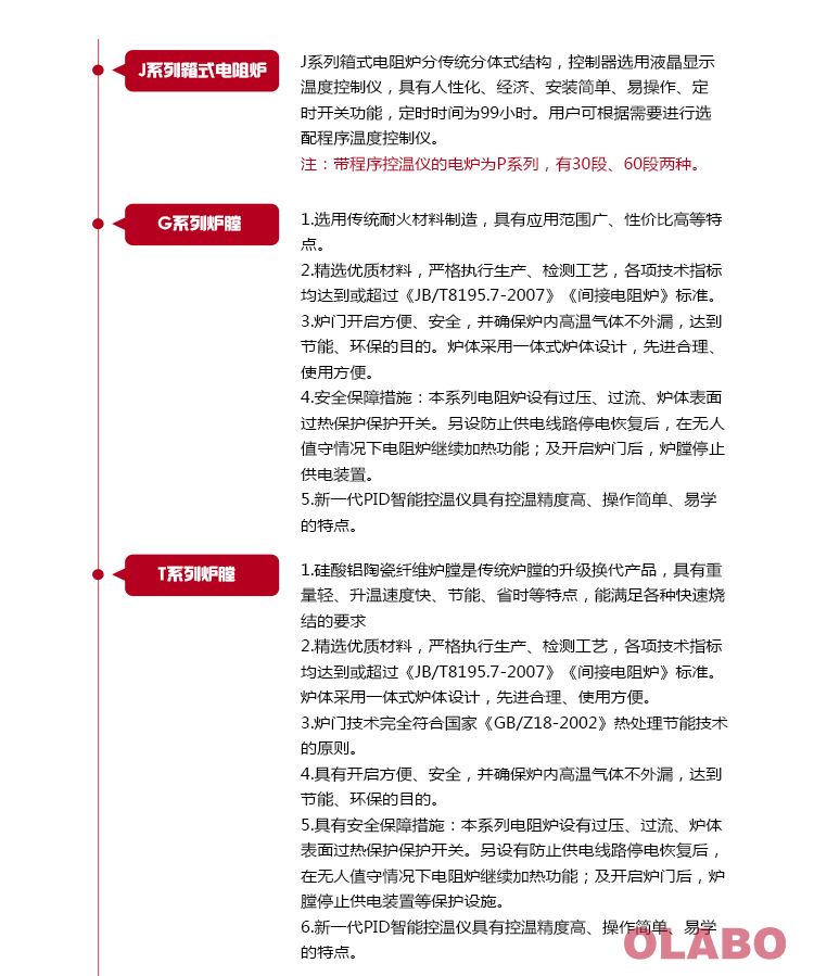1、T系列爐膛---硅酸鋁陶瓷纖維爐膛是傳統(tǒng)爐膛的升級換代產(chǎn)品,具有重量輕、升溫速度快、節(jié)能、省時等特點,能滿足各種快速燒結(jié)的要求. 2、精選優(yōu)質(zhì)材料,嚴(yán)格執(zhí)行生產(chǎn)、檢測工藝4、爐門結(jié)構(gòu)采用全方位密封技術(shù)。具有開啟方便、安全,并確保爐內(nèi)高溫氣體不外漏,達(dá)到節(jié)能、環(huán)保的目的。 3、具有安全保障措施:本系列電阻爐設(shè)有過壓、過流、爐體表面過熱保護保護開關(guān)。另設(shè)有防止供電線路停電恢復(fù)后,在無人值守情況下電阻爐繼續(xù)加熱功能;及開啟爐門后,爐膛停止供電裝置等保護設(shè)施。 4、新一代PID智能控溫儀具有控溫精度高、操作簡單、易學(xué)的特點。